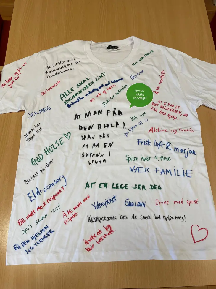 På Kongssenteret møtte vi mange nysgjerrige og engasjerte forbipasserende. Vi stilte dem det enkle, men kraftfulle spørsmålet: Hva er viktig for deg i møte med helsevesenet? Svarene ble skrevet ned på en t-skjorte, som etter hvert ble et fargerikt og visuelt uttrykk for det som virkelig betyr noe for folk flest.